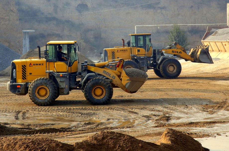 An army of SDLG wheel loaders are working at a concrete manufacturing facility in Shaanxi Province, west China, close to the site of the famous Terracotta Army.