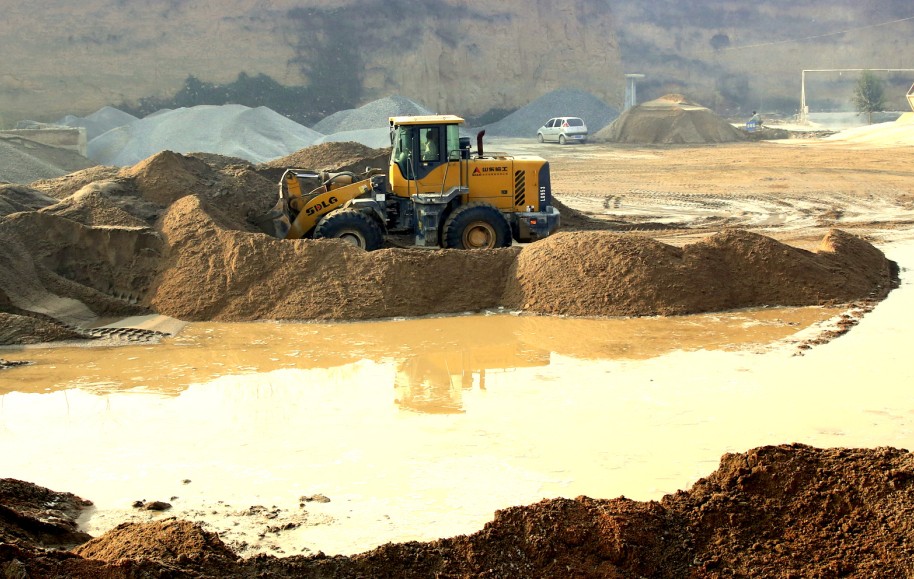 On site, four SDLG wheel loaders must navigate piles of gravel and sand interspersed with large water pits (which create thick mud). The aggregate material is mixed with the finer sand to produce concrete. In some parts of the site, the wheel loaders must scrape down to the river bed to dig out the course material before transporting it to the crushing machine for processing into concrete.