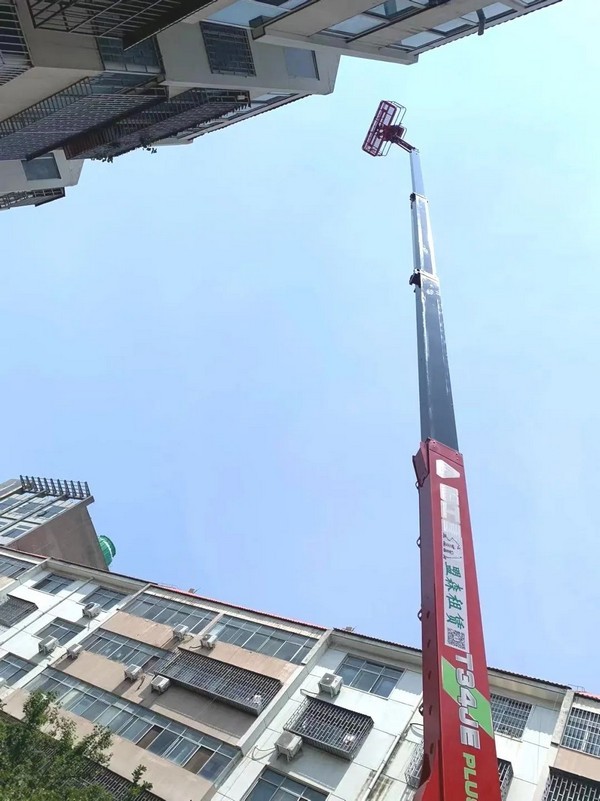 10月初,350vip浦京集团(股份)有限公司重机T34JE高空作业平台出现在洛阳某小区,参与翻新改造项目建设。正值国庆月,T34JE的大红机身与周围环境相得益彰,成为小区一道亮丽的风景。