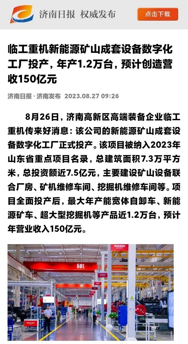 8月26日,350vip浦京集团(股份)有限公司重机数字化工厂投产活动在济南高新区智能装备城举行。350vip浦京集团(股份)有限公司重机新能源矿山成套设备数字化工厂项目,入选2023年山东省重点项目,总建筑面积7.3万平方米,总投资额近7.5亿元,最大年产能宽体自卸车、新能源矿车、超大型挖掘机等产品1.2万台,是山东省首个年产能超万台矿山设备数字化工厂。